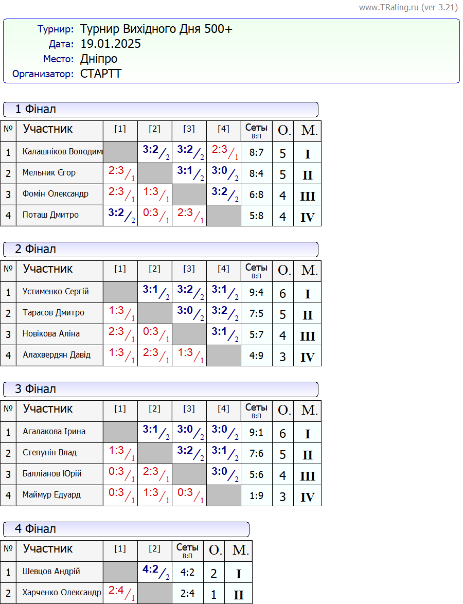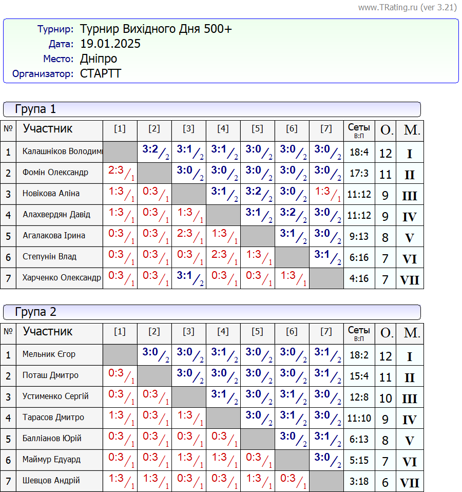 Результати турніру “Вихідного дня 0-500+” за 19.01.2025