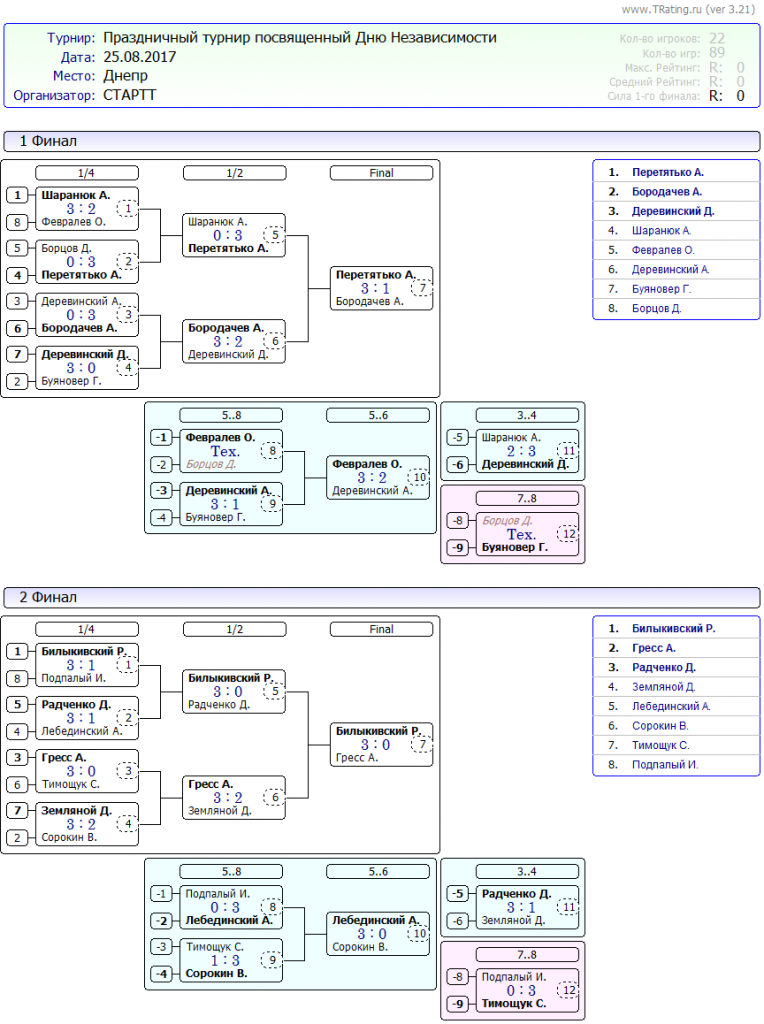 Вашему вниманию результаты второго праздничного турнира посвященному Дню Независимости Украины, 25.08.2017г