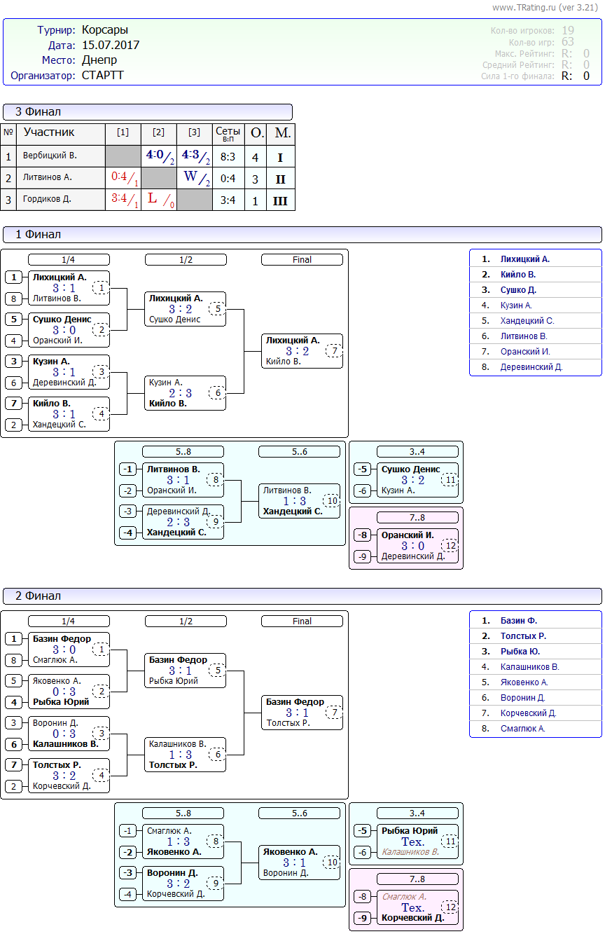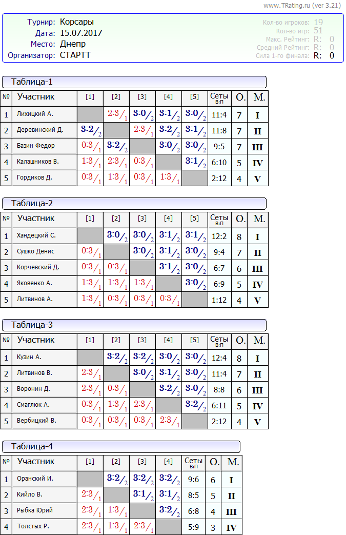 Вашему вниманию результаты турнира Корсары от 15.07.2017г