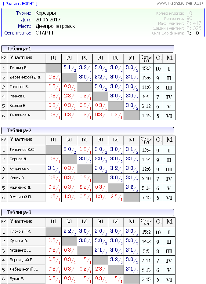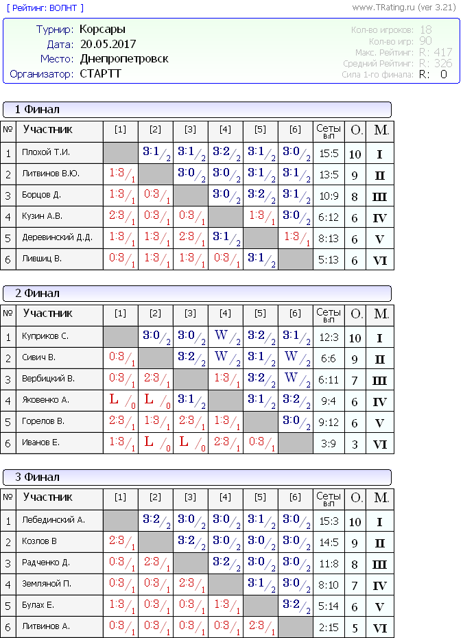 Вашему вниманию результаты турнира Корсары от 20.05.2017г
