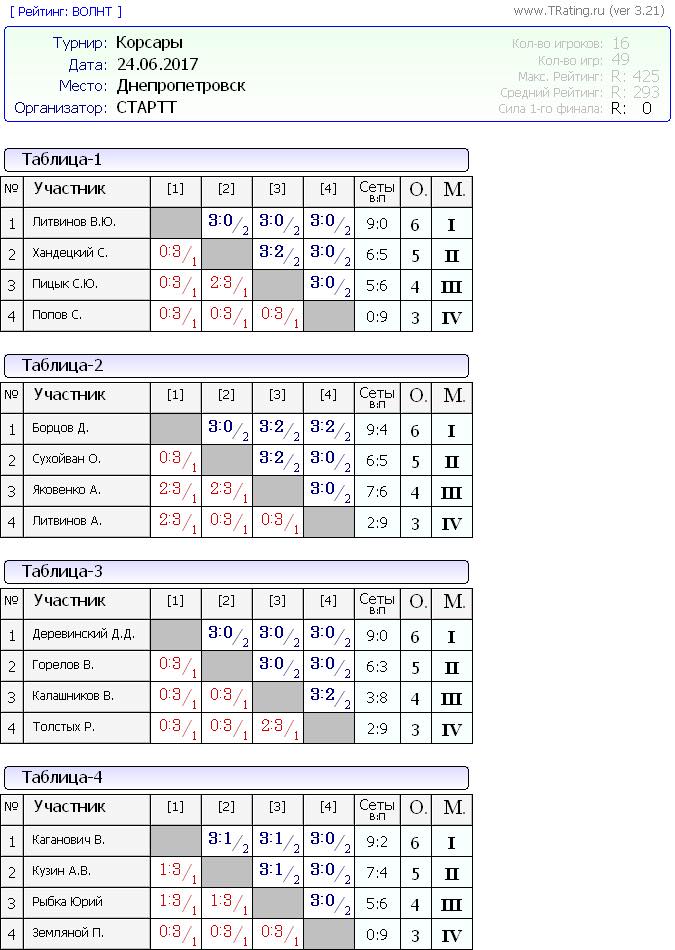 Вашему вниманию результаты турнира Корсары от 24.06.2017г