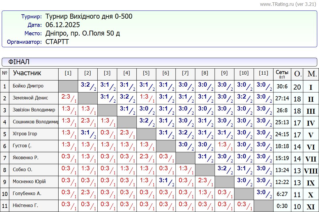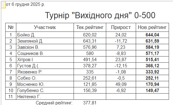 Результати турніру “Вихідного дня 0-500” за 06.12.2025