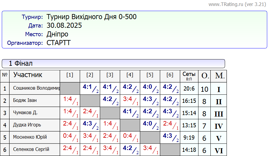 Результати турніру “Вихідного дня 0-500” за 30.08.2025