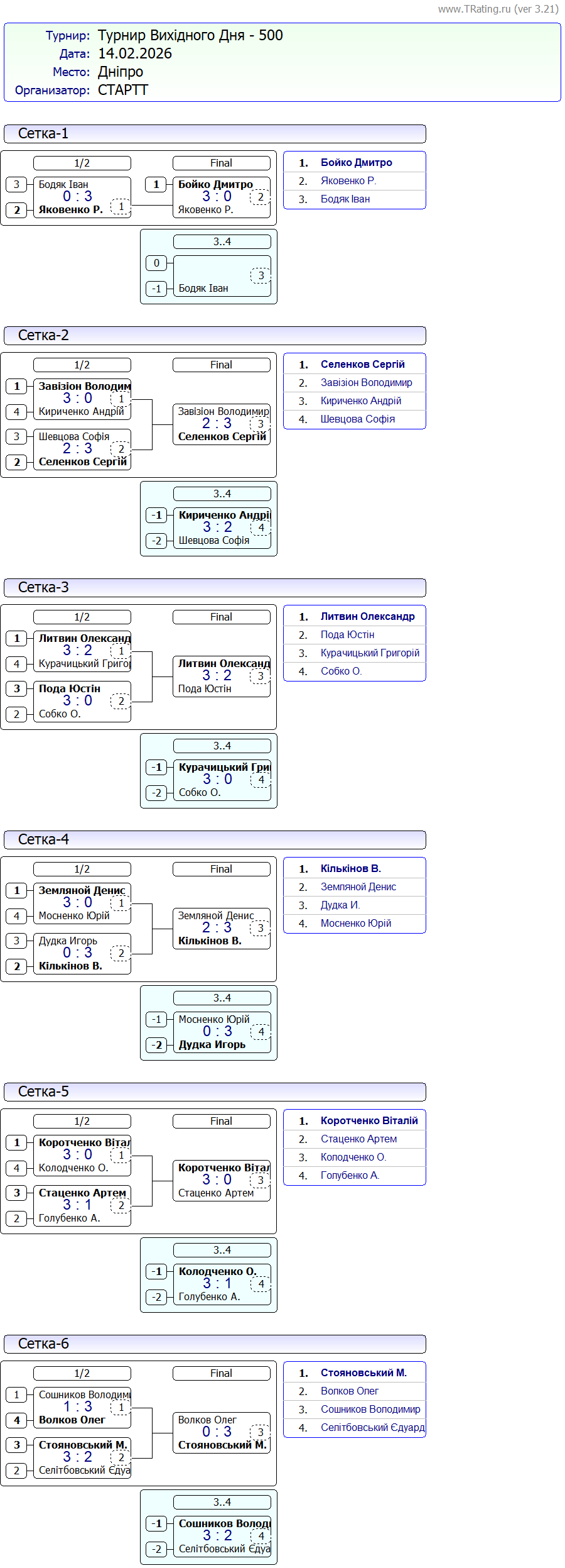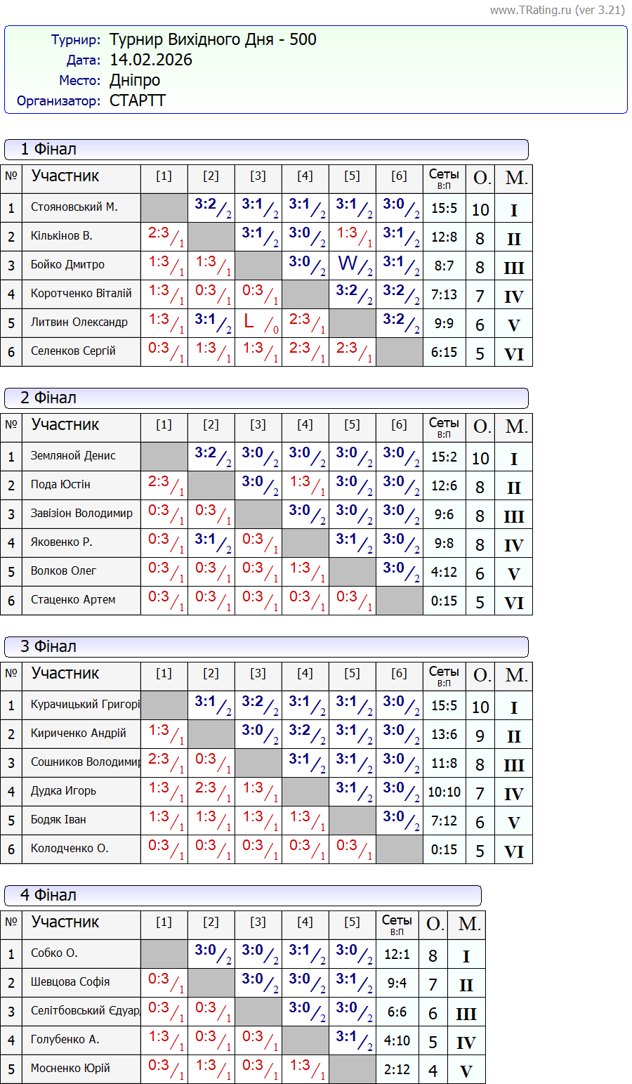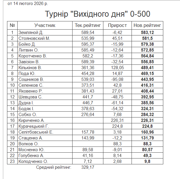 Результати турніру “Вихідного дня 0-500” за 14.02.2026