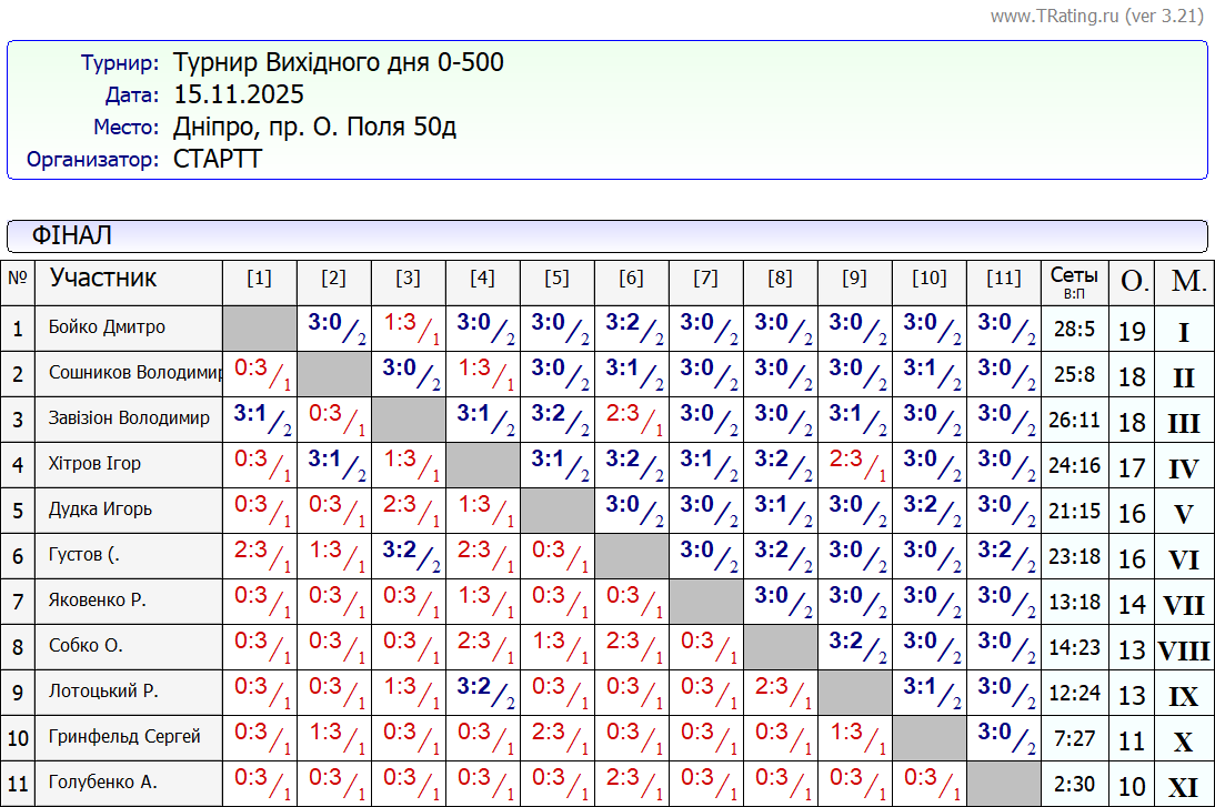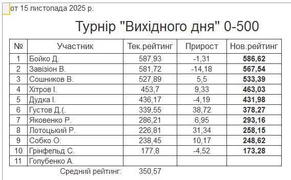 Результати турніру “Вихідного дня 0-500” за 15.11.2025