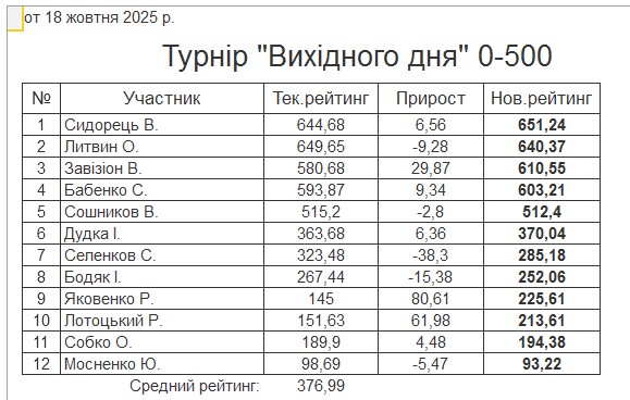 Результати турніру “Вихідного дня 0-500” за 18.10.2025