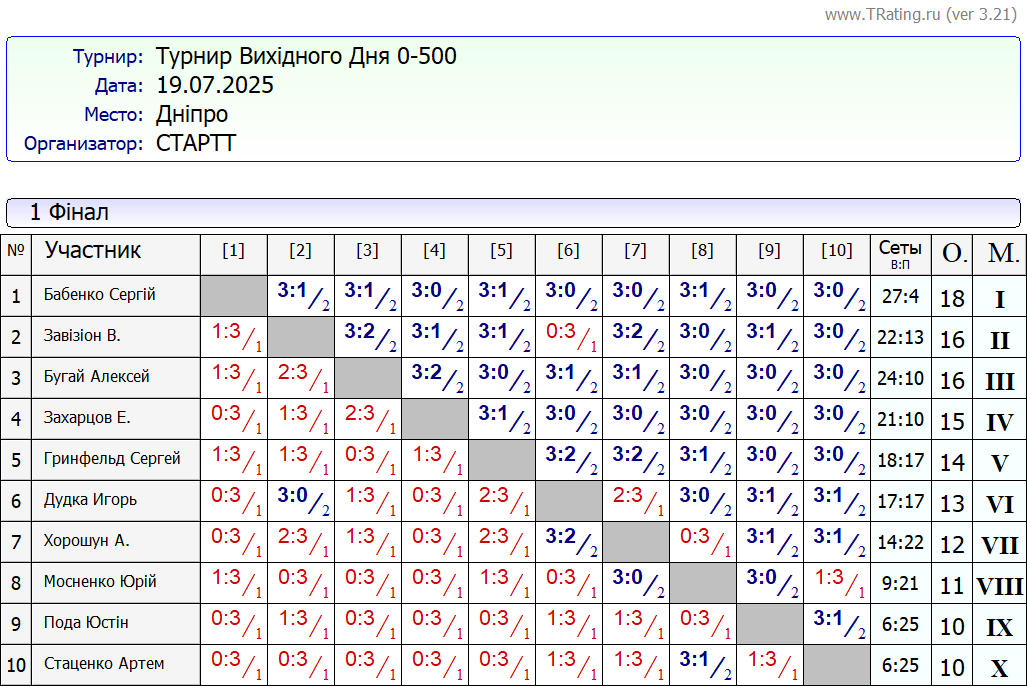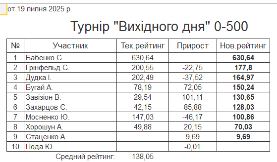 Результати турніру “Вихідного дня 0-500” за 19.07.2025