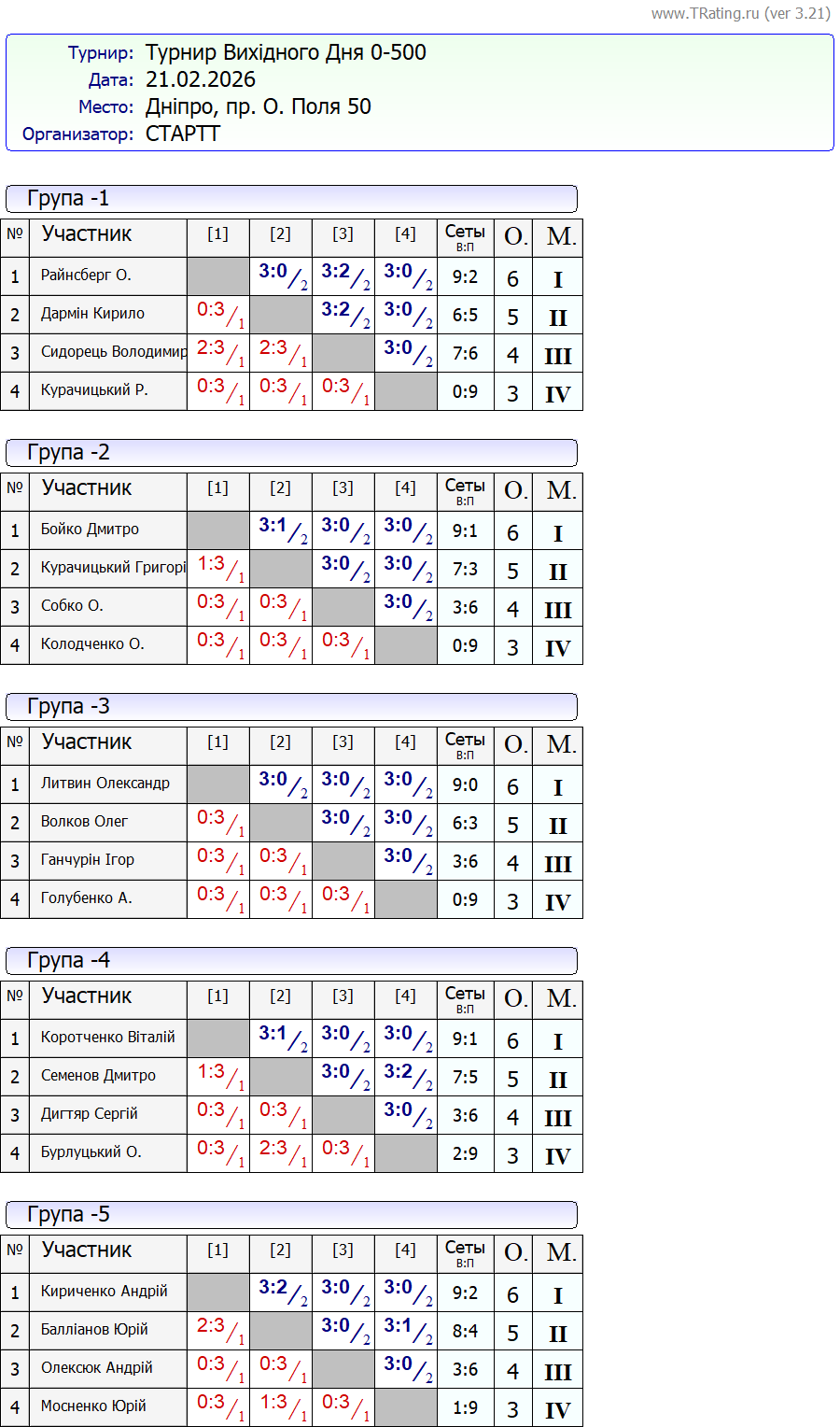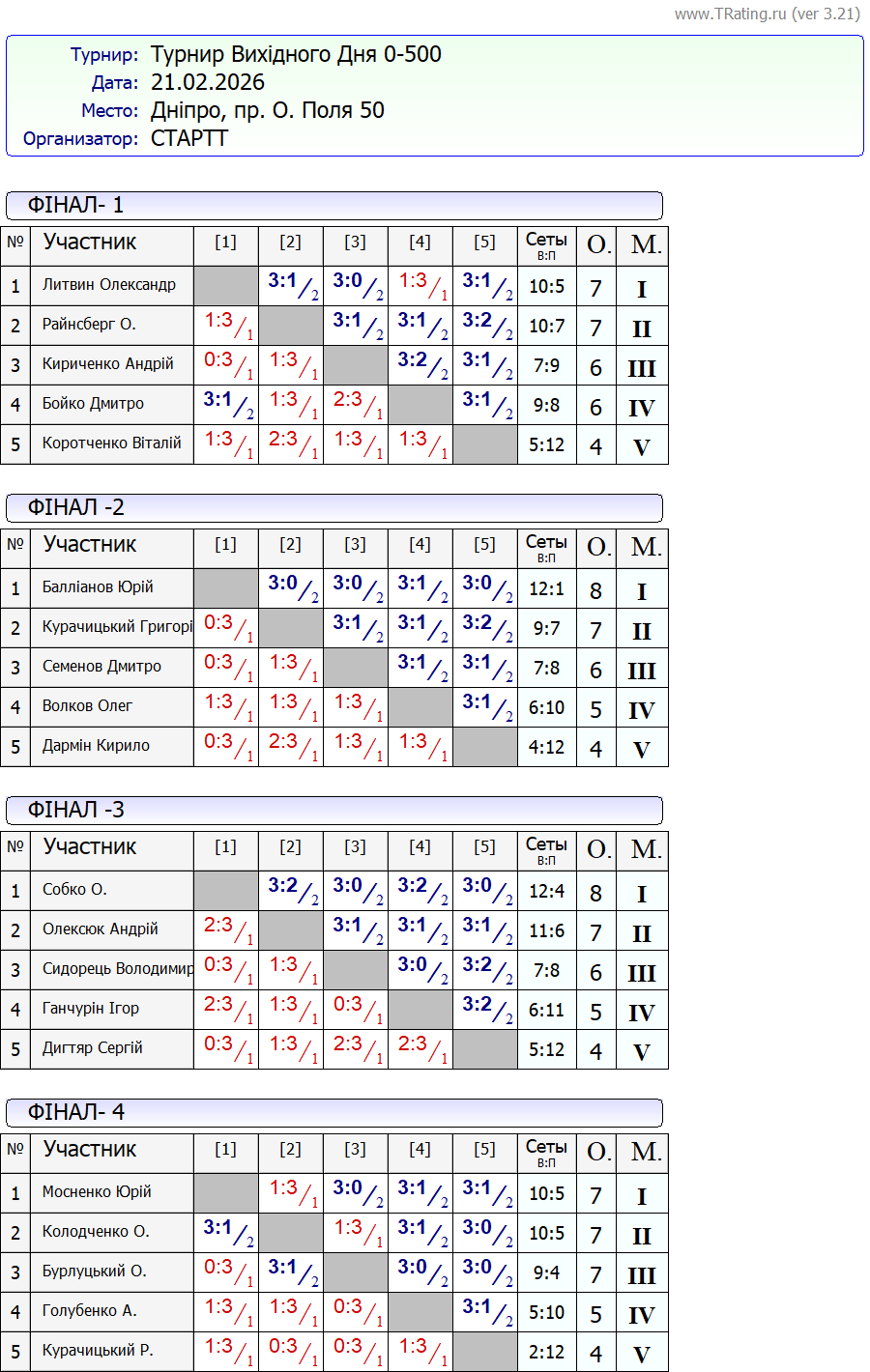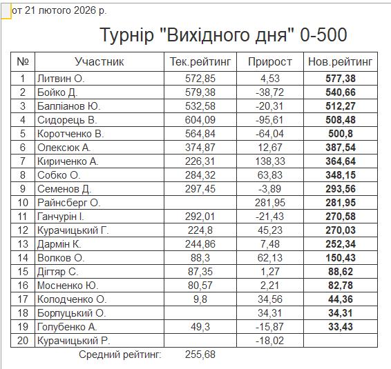 Результати турніру “Вихідного дня 0-500” за 21.02.2026