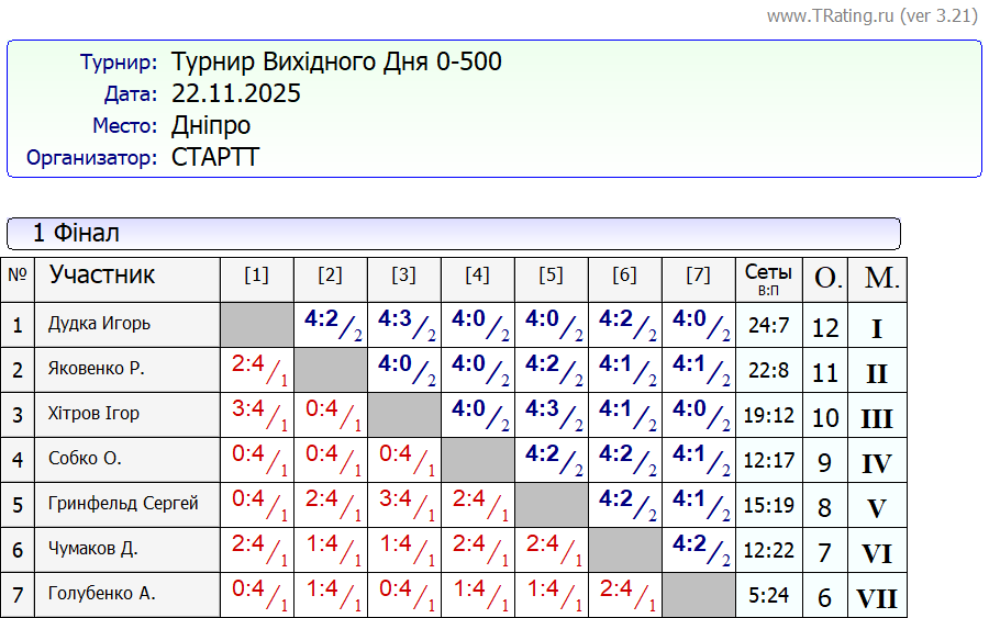 Результати турніру “Вихідного дня 0-500” за 22.11.2025