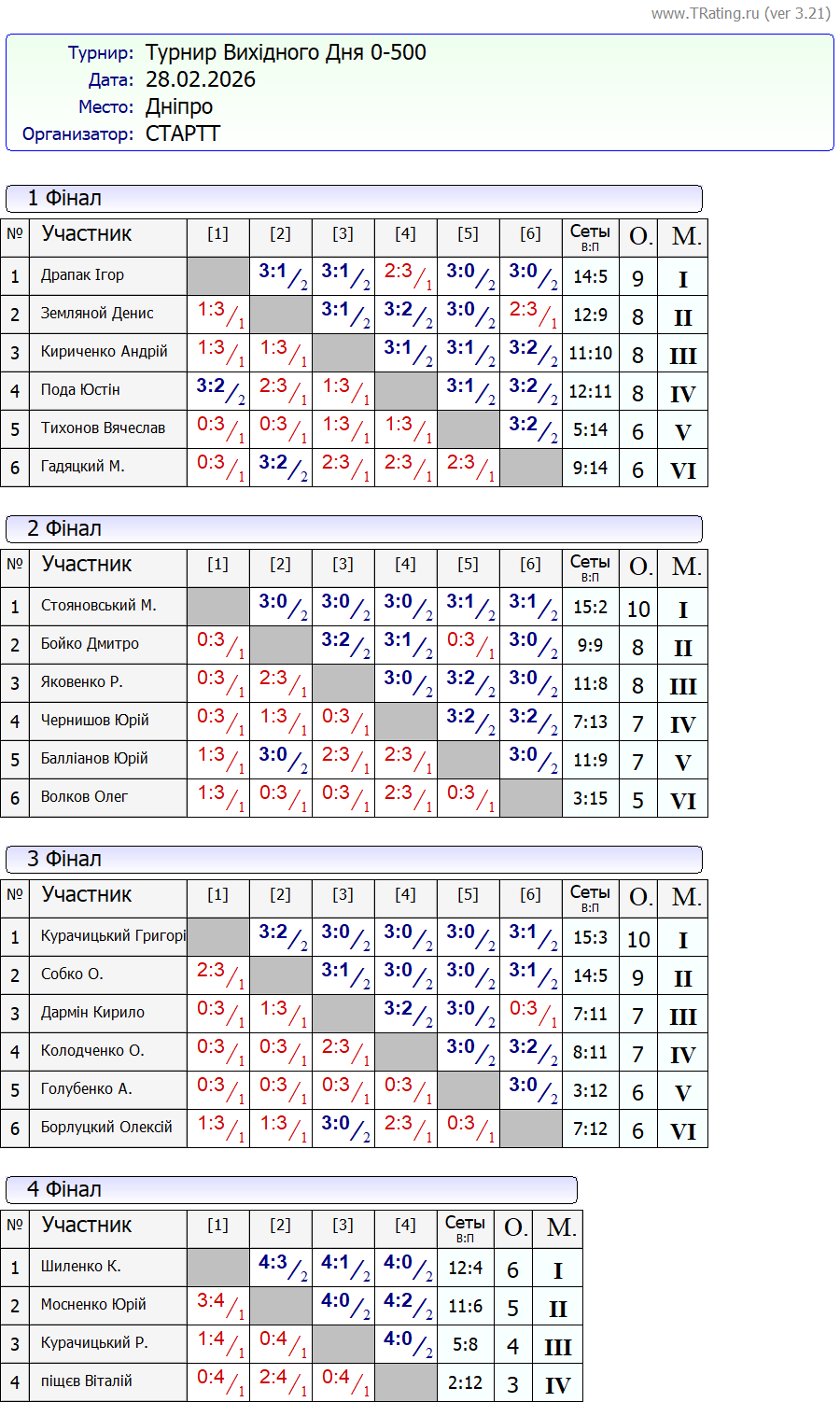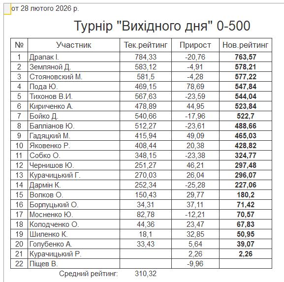 Результати турніру “Вихідного дня 0-500” за 28.02.2026