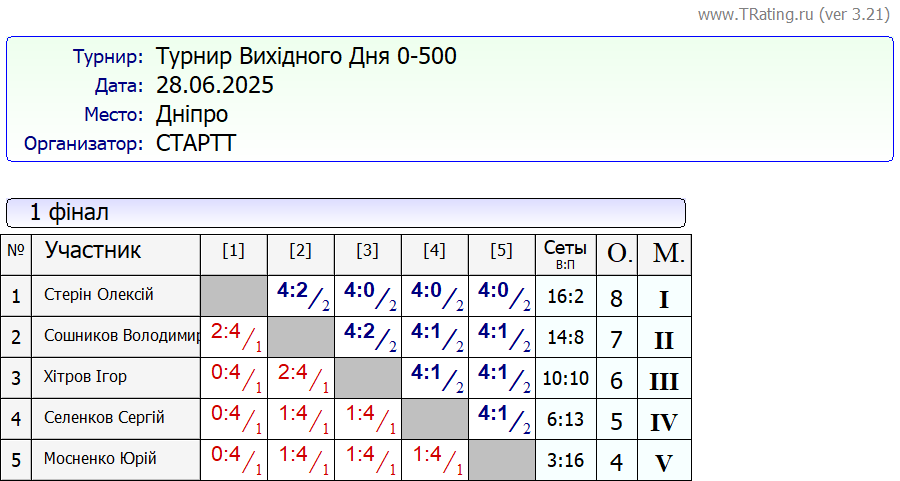 Результати турніру “Вихідного дня 0-500” за 28.06.2025