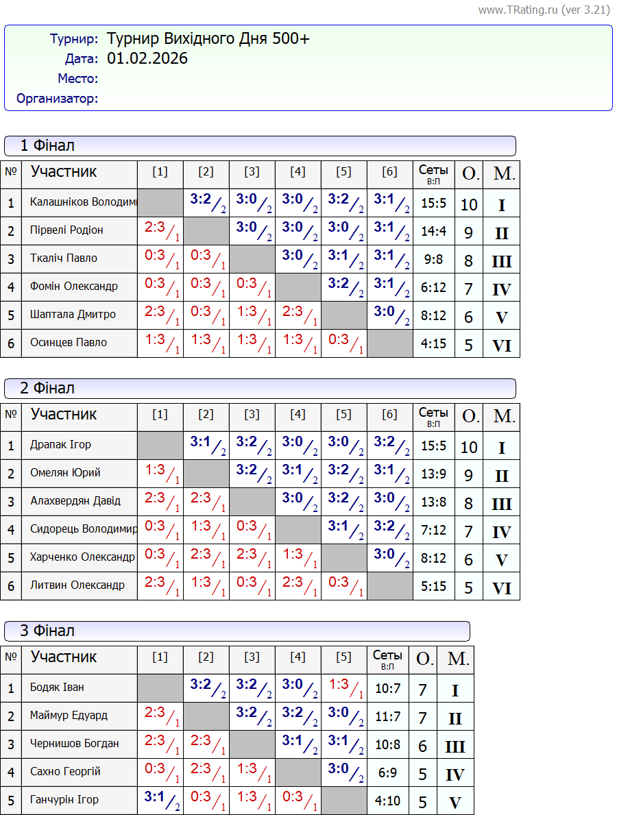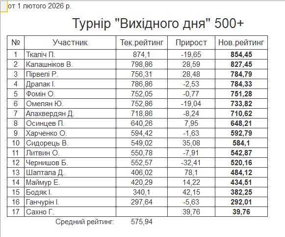 Результати турніру “Вихідного дня 500” за 1.02.2026