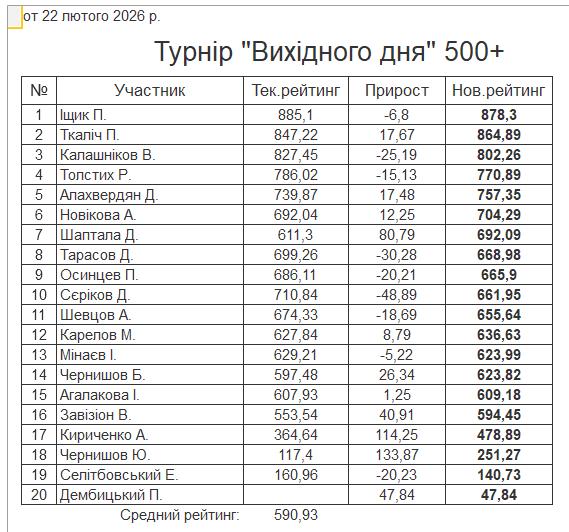 Результати турніру “Вихідного дня 500+” за 22.02.2026