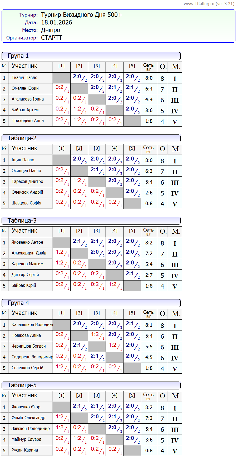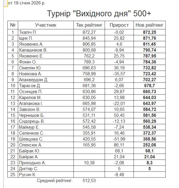 Результати турніру “Вихідного дня 500+” за 18.01.2026