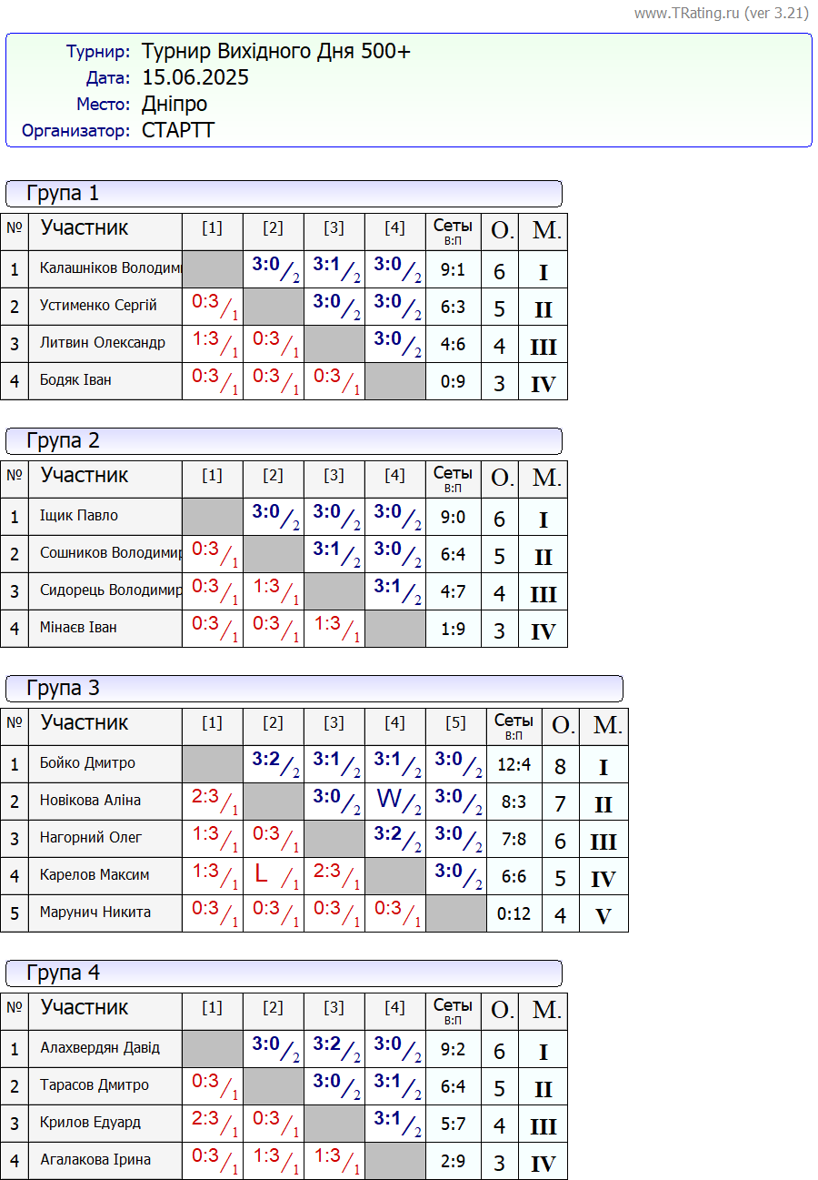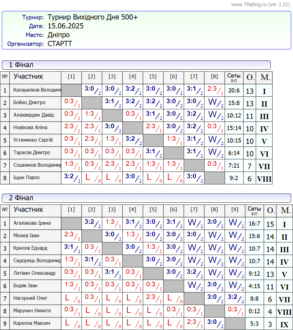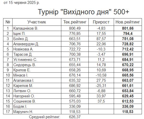 Результати турніру “Вихідного дня 500+” за 15.06.2025