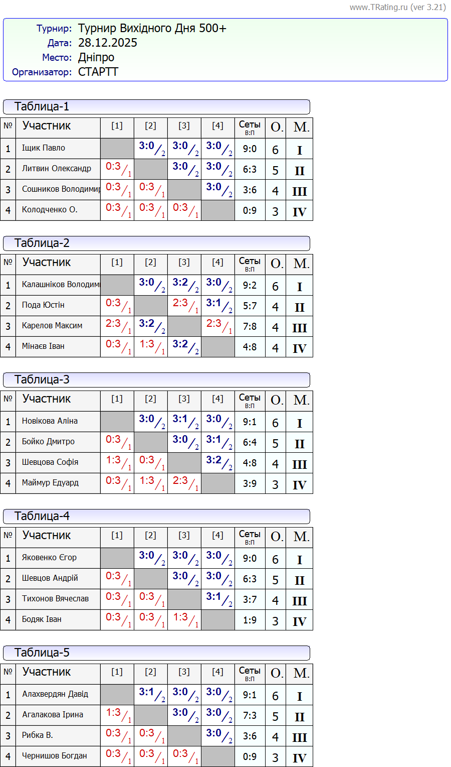Результати турніру “Вихідного дня 500+” за 28.12.2025