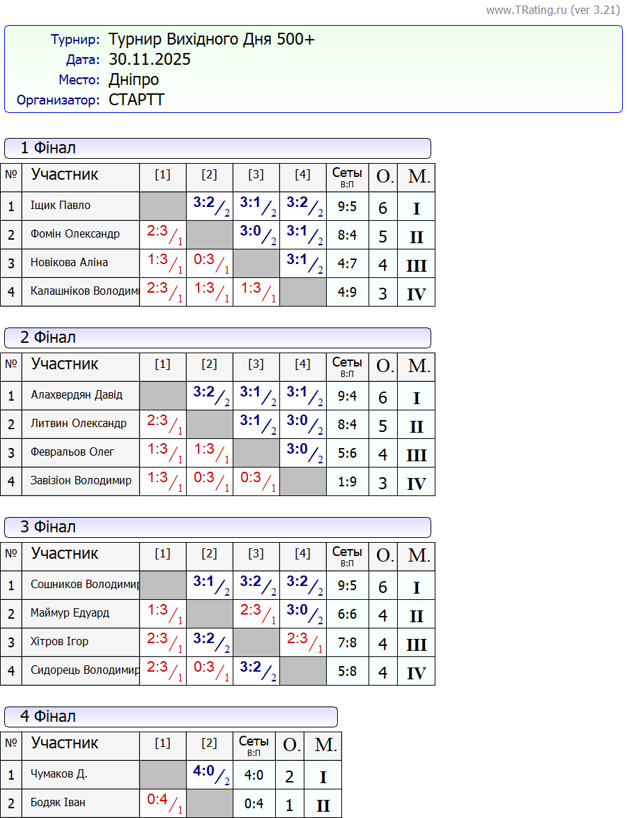 Результати турніру “Вихідного дня 500+” за 30.11.2025