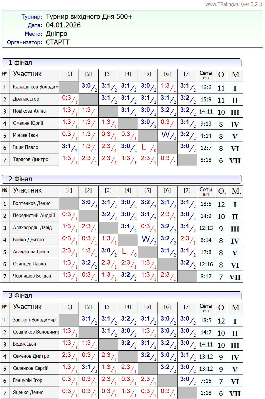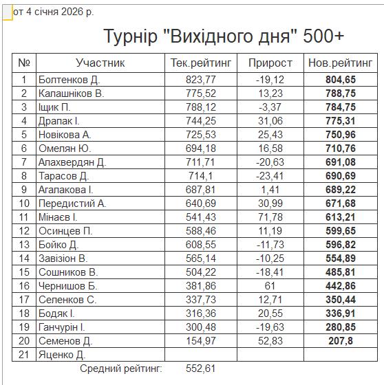 Результати турніру “Вихідного дня 500+” за 4.01.2026