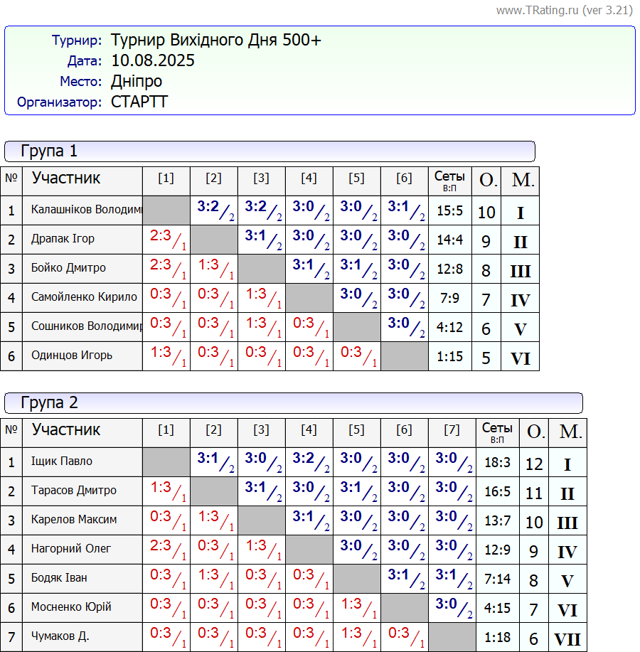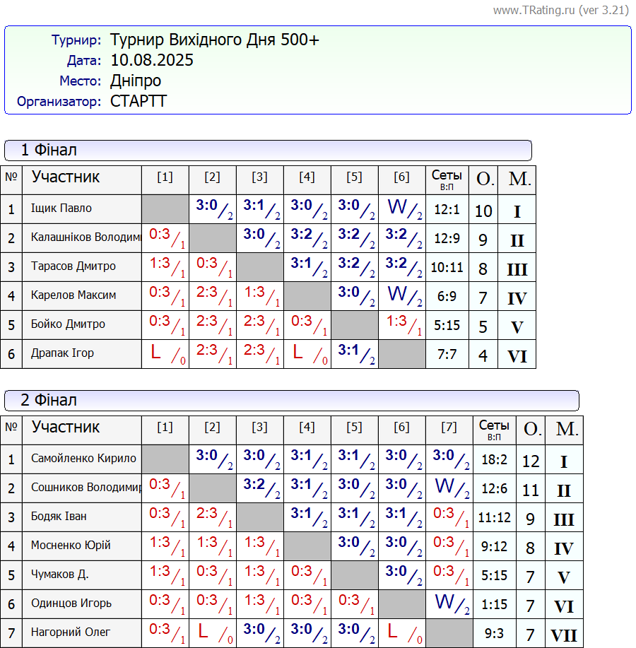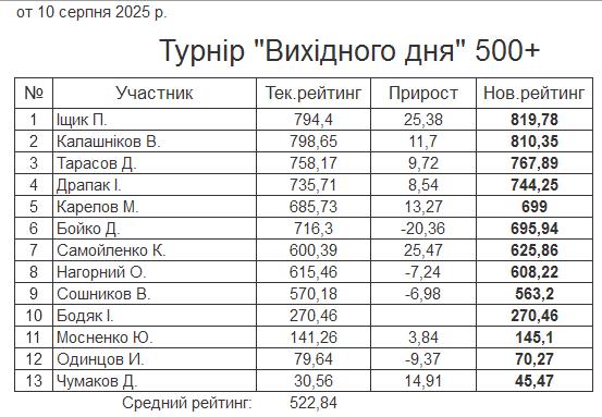 Результати турніру “Вихідного дня 500+” за 10.08.2025