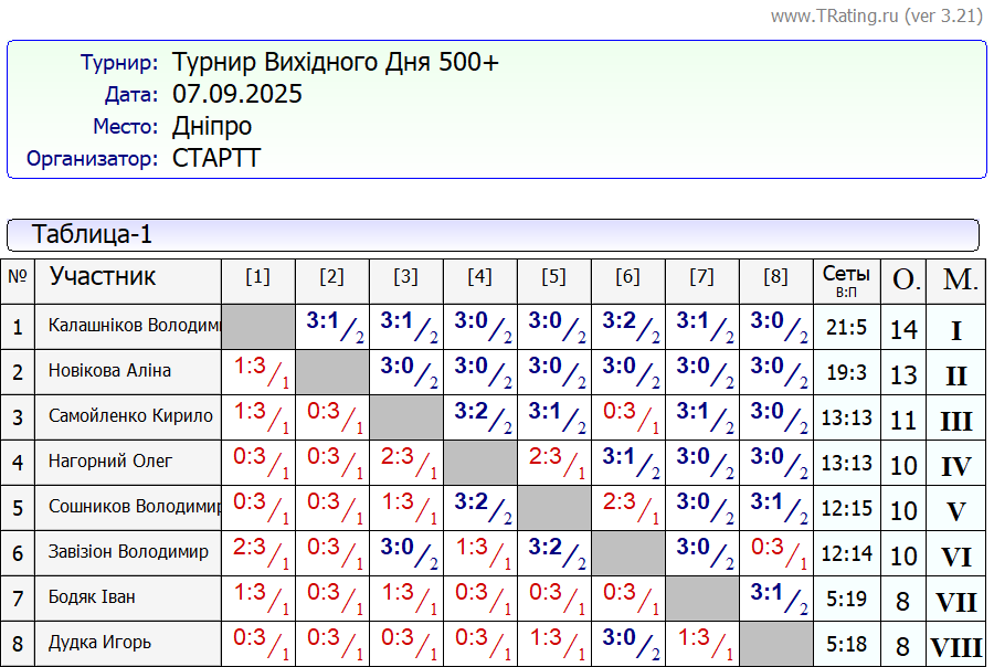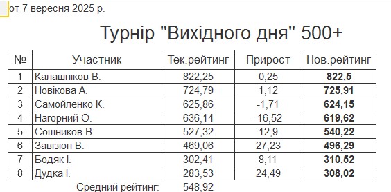 Результати турніру “Вихідного дня 500+” за 07.09.2025
