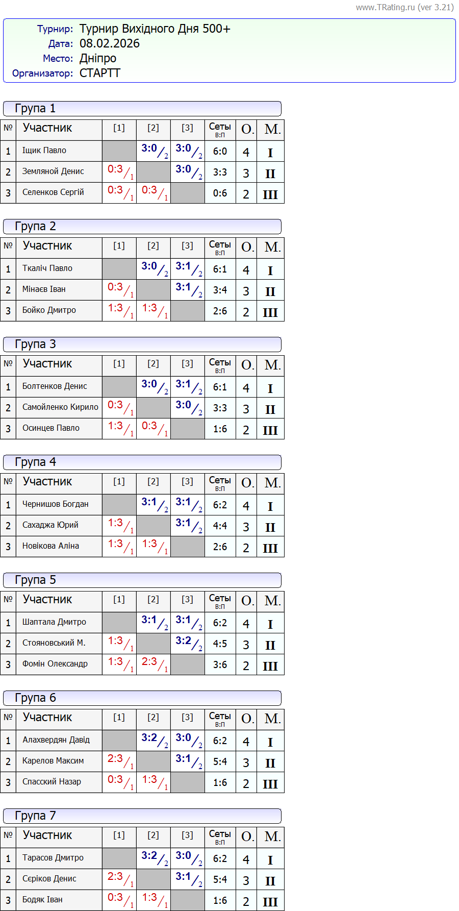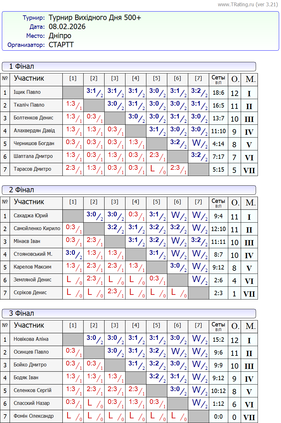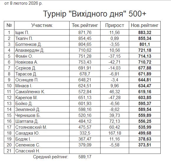 Результати турніру “Вихідного дня 500+” за 8.02.2026