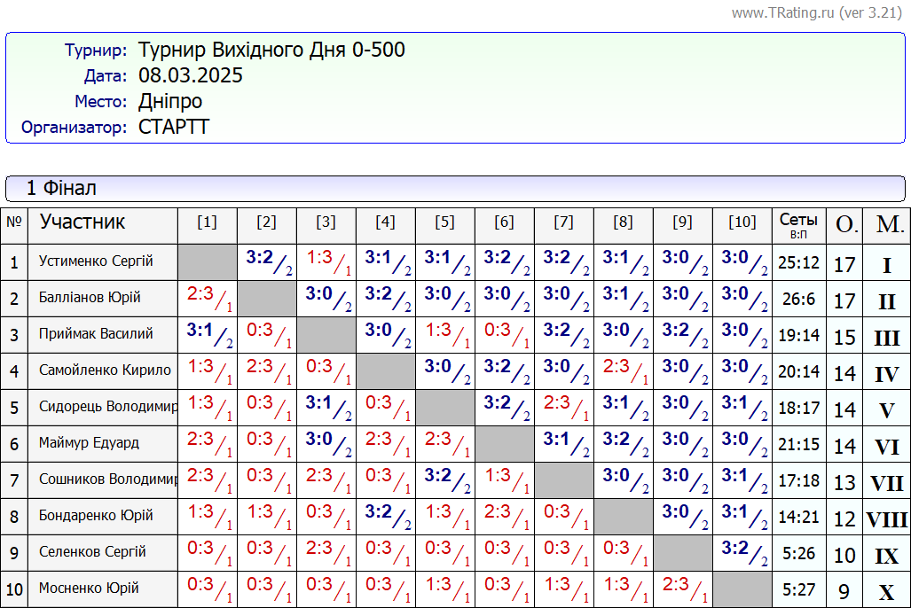 Результати турніру “Вихідного дня 0-500” за 8.03.2025