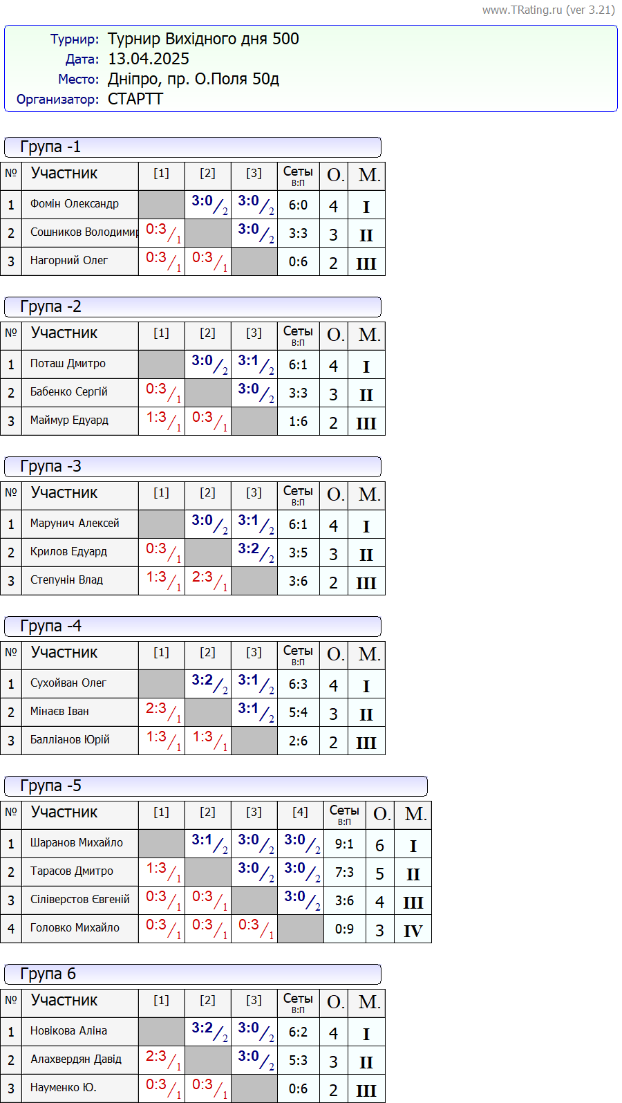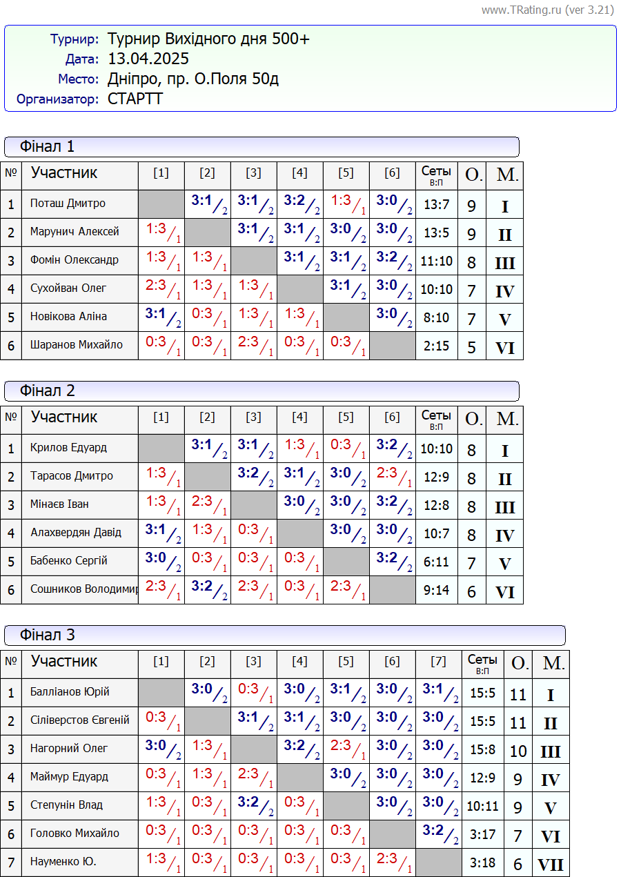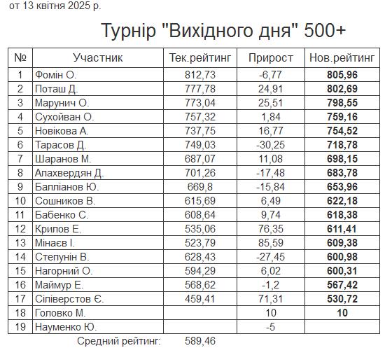 Результати турніру “Вихідного дня 500+” за 13.04.2025
