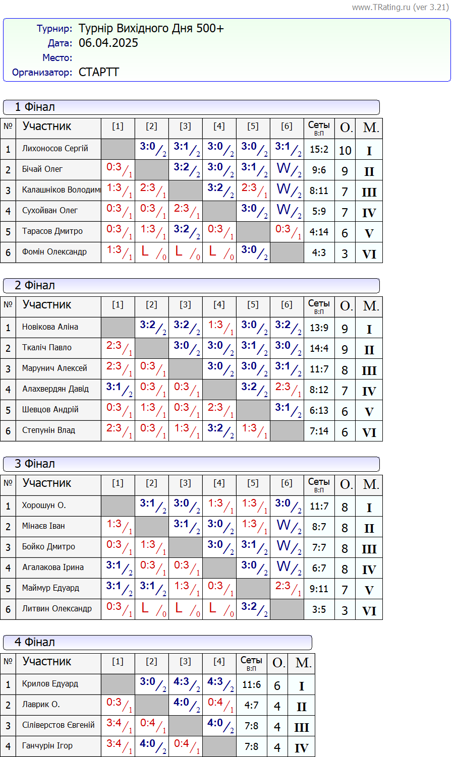 Результати турніру “Вихідного дня 500+” за 6.04.2025
