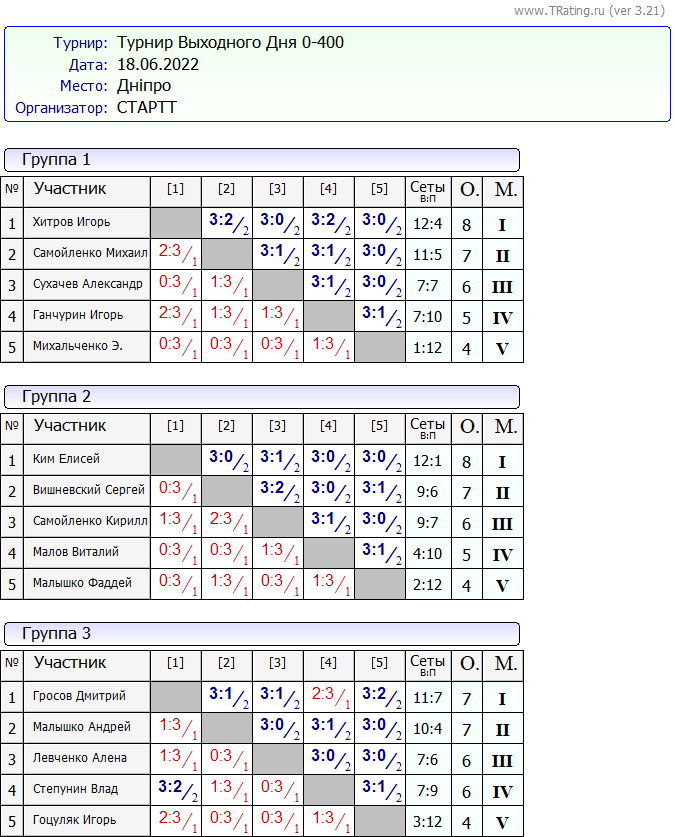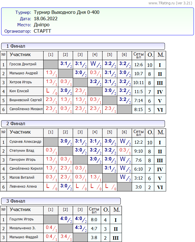 Результаты Турнира “Выходного Дня 0-400” за 18.06.2022