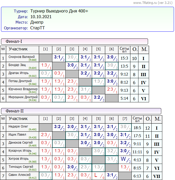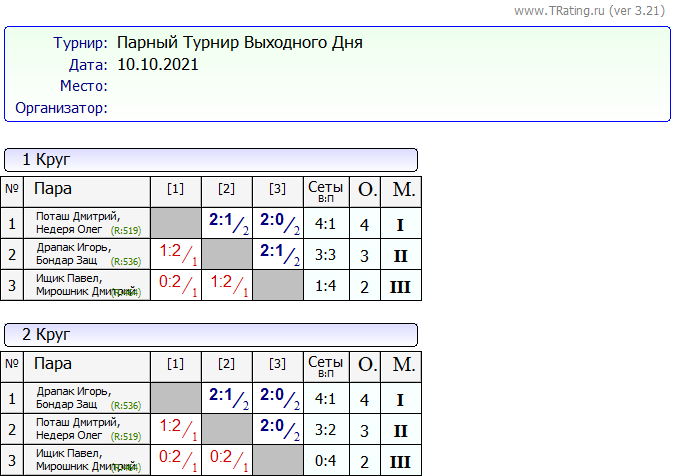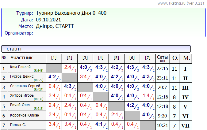 Результаты Турнира “Выходного Дня” 09-10.10.2021