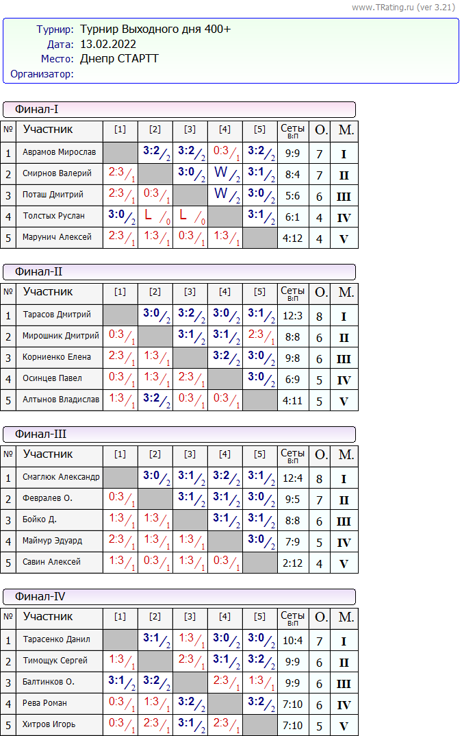 Результаты Турнира “Выходного Дня 400+” за 13.02.2022