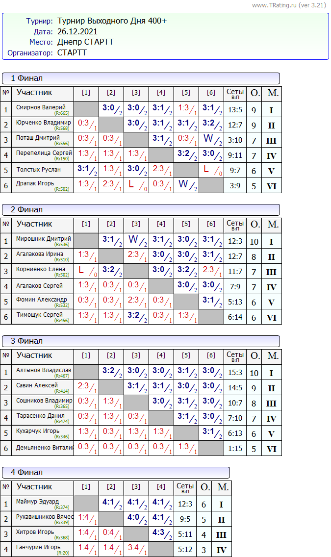 Результаты Турнира “Выходного Дня” 400+ за 26.12.2021