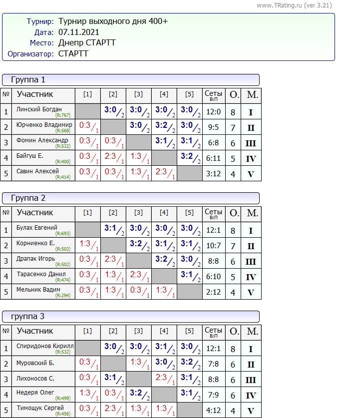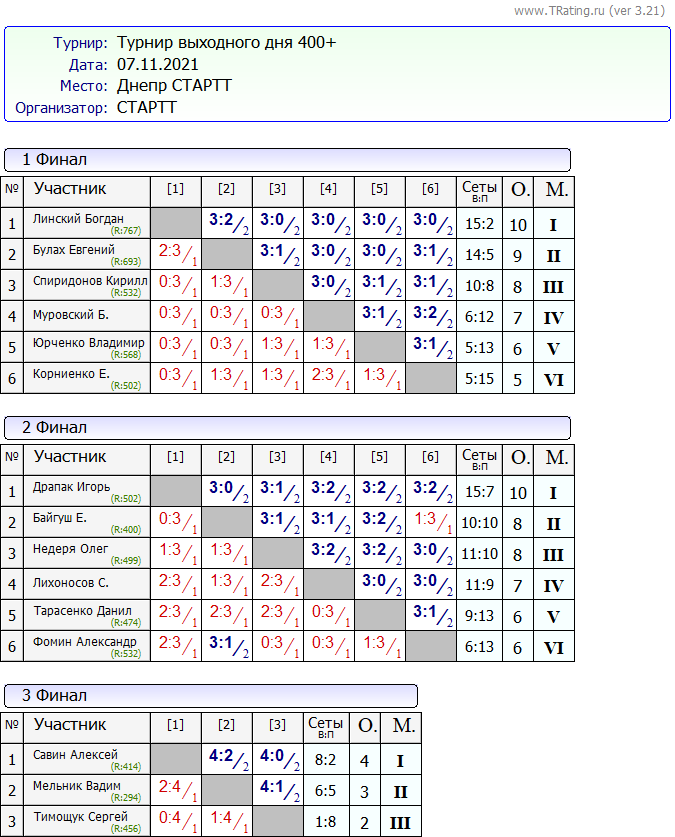 Результаты Турнира “Выходного Дня” 400+ за 07.11.2021