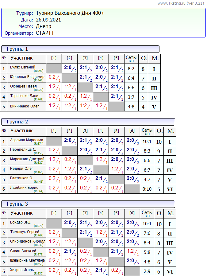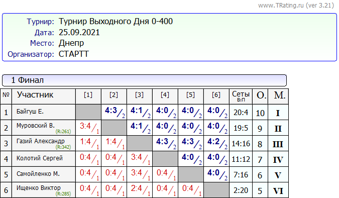 Результаты турнира “Выходного дня” 25 – 26.09.2021