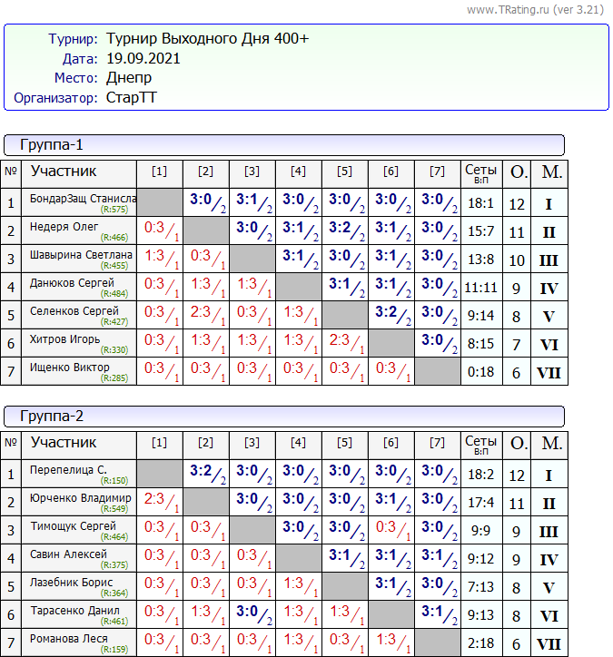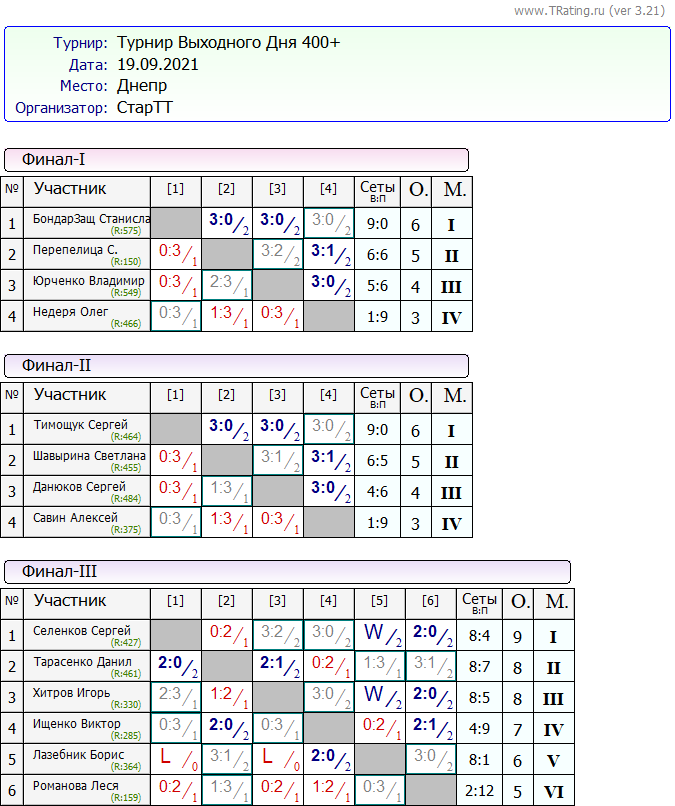 Результаты турнира “Выходного дня” (400+) 19.09.2021