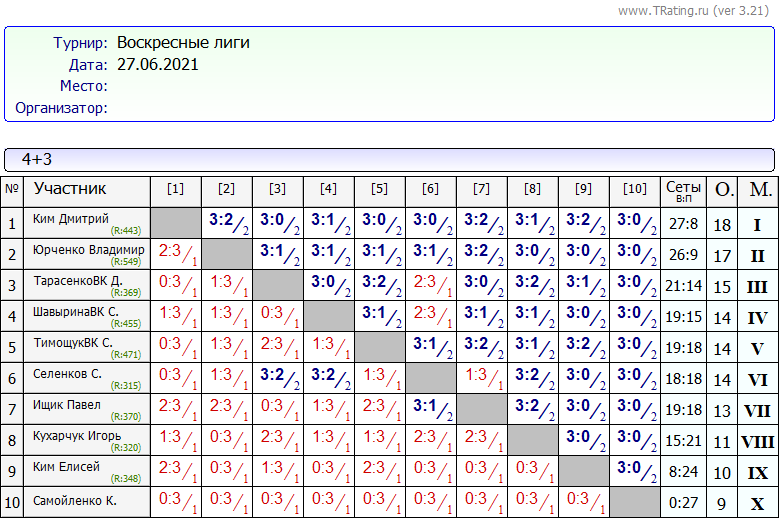 Результаты Воскресных Лиг 27.06.2021
