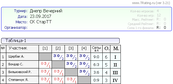Результаты турнира Днепр Вечерний от 23.09.2017