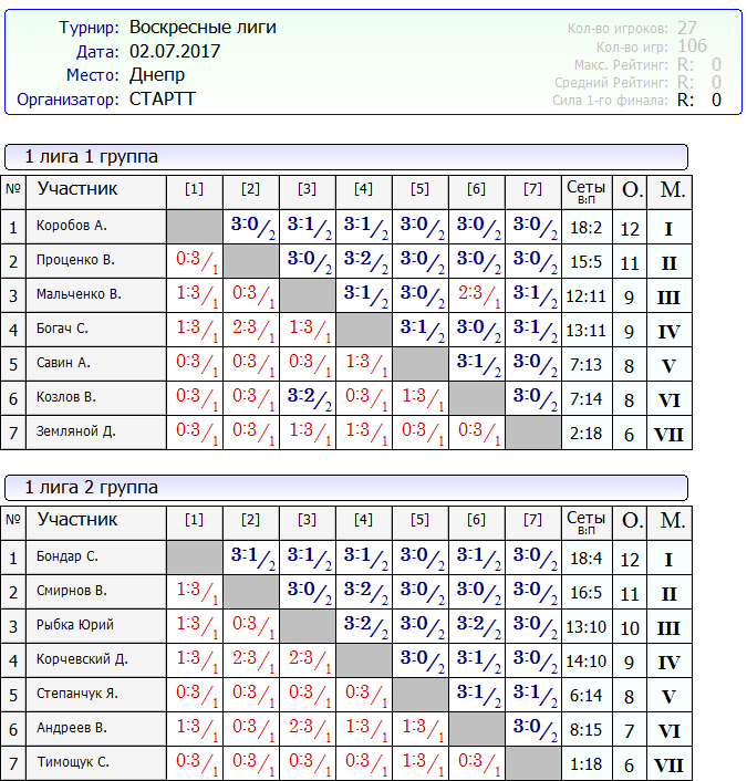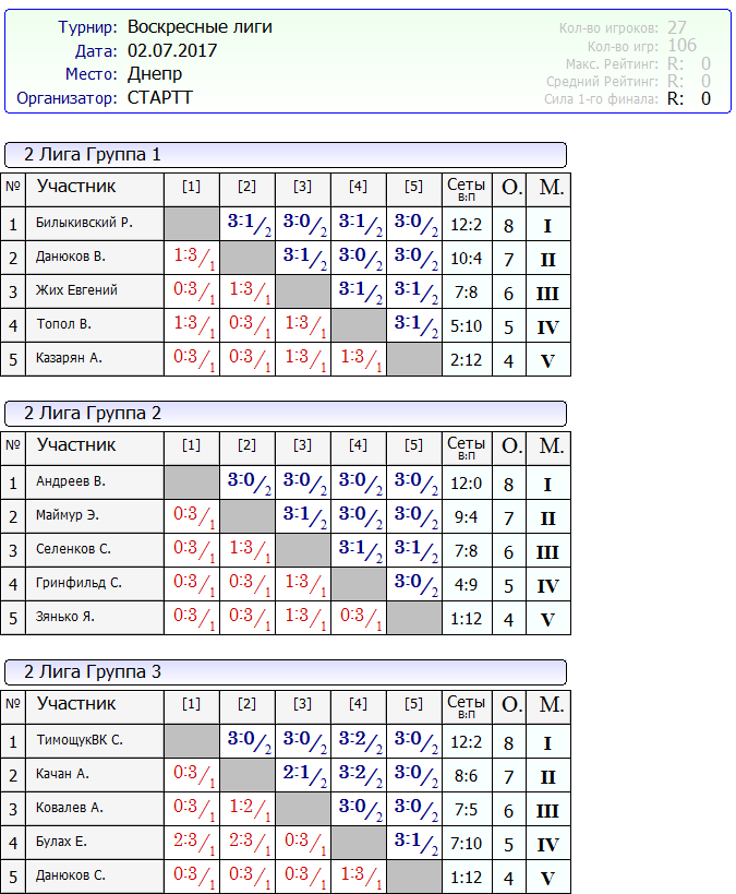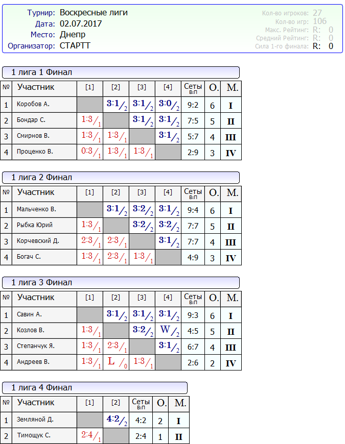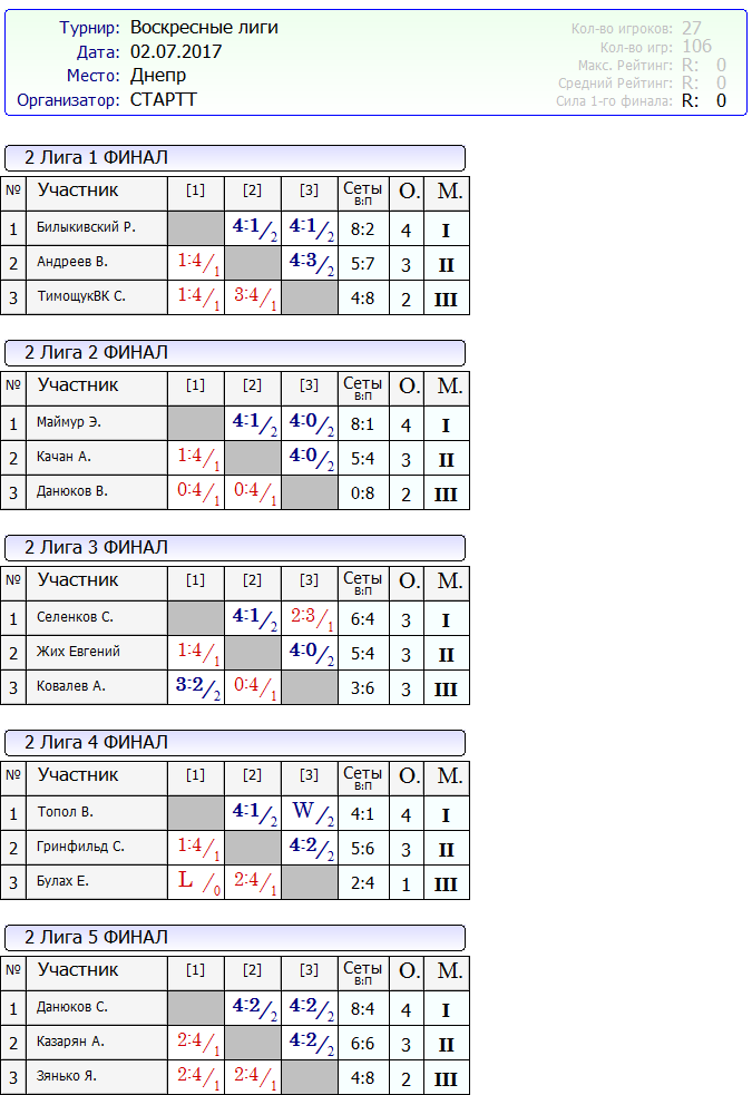 Результаты Воскресных лиг от 02.07.2017г