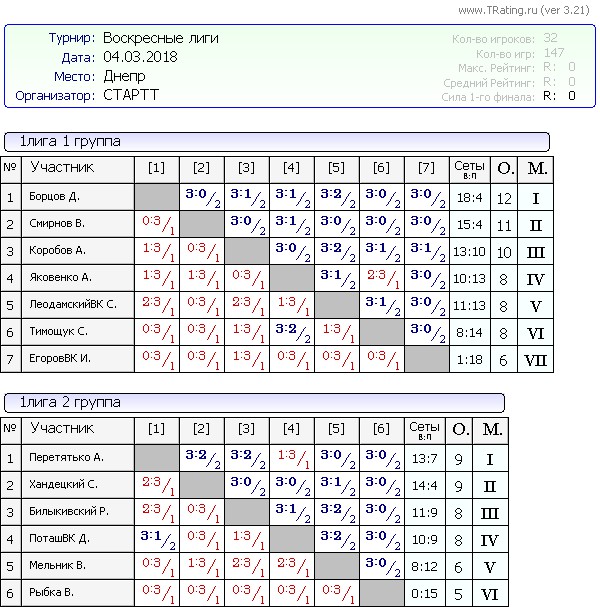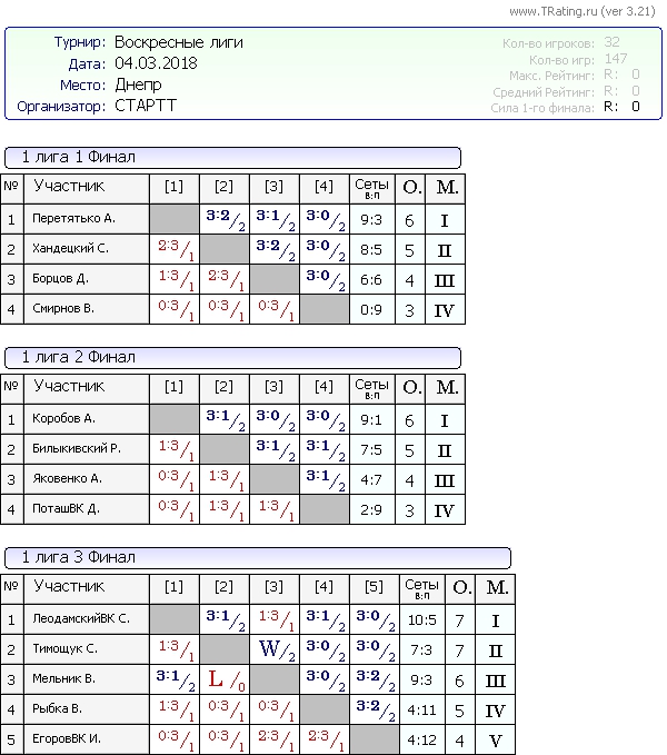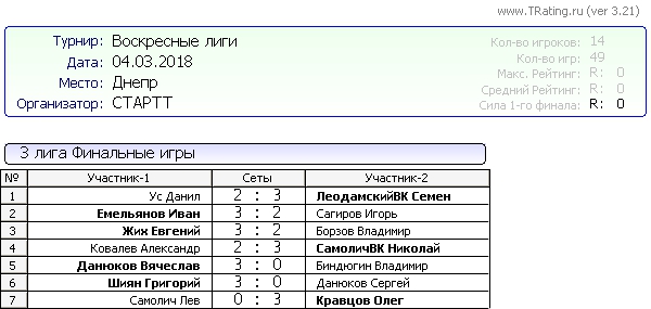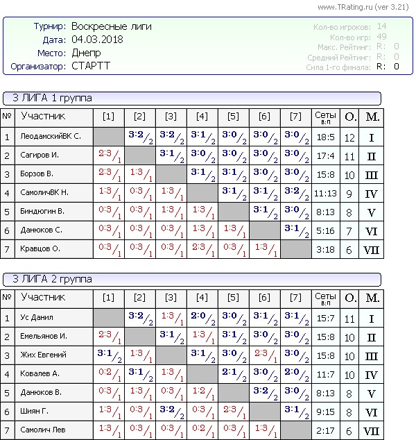 Результаты Воскресных лиг от 04.03.2018г