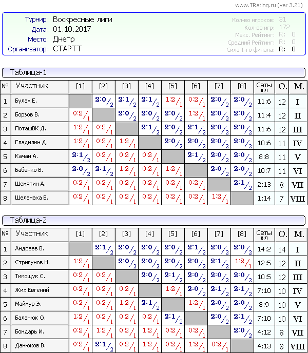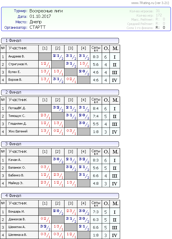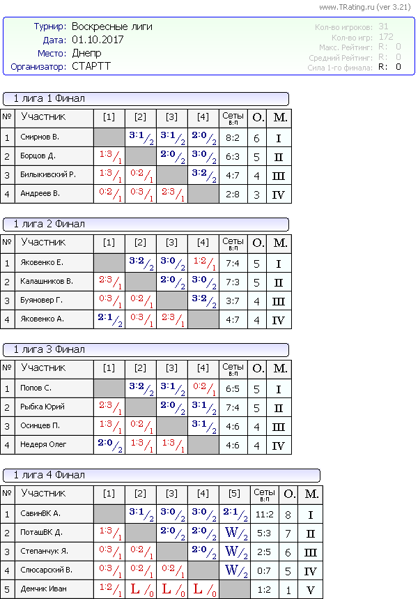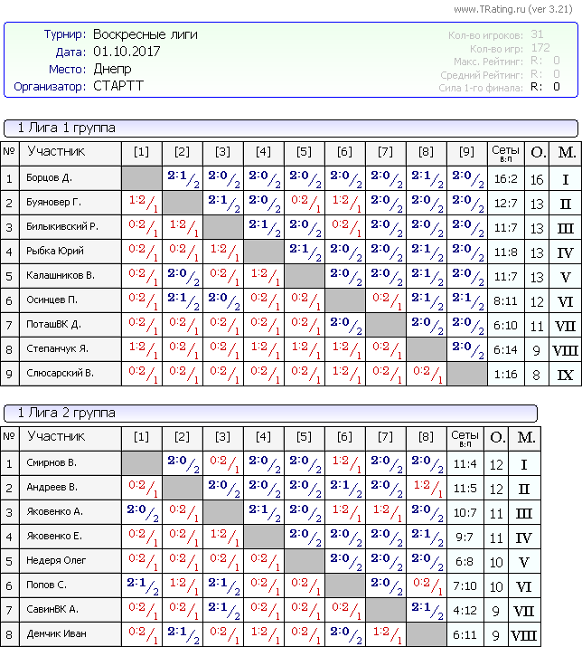 Результаты Воскресных лиг от 1.10.2017г