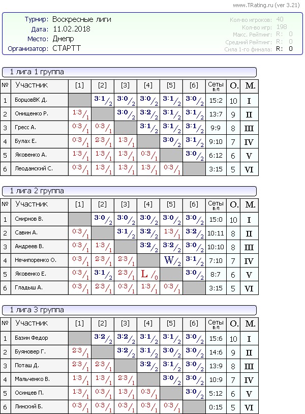 Результаты Воскресных лиг от 11.02.2018г