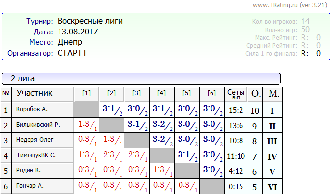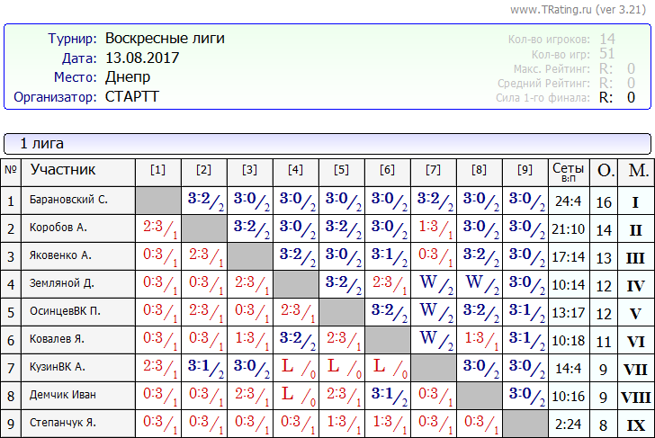 Результаты Воскресных лиг от 13.08.2017г