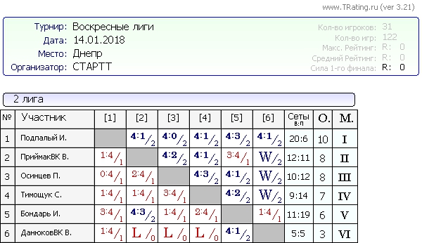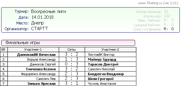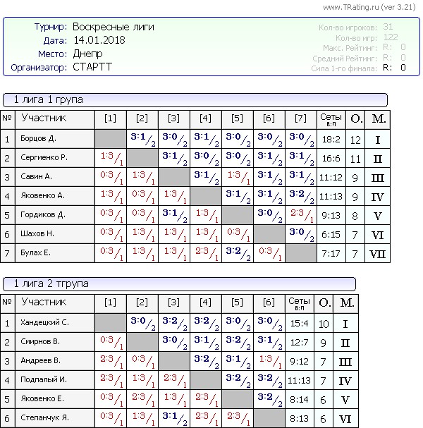 Результаты Воскресных лиг от 14.01.2018г