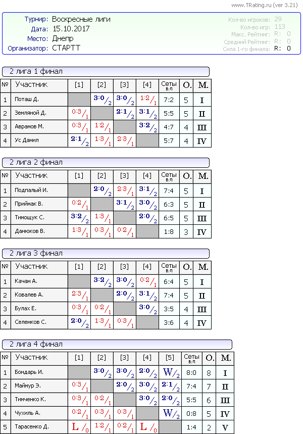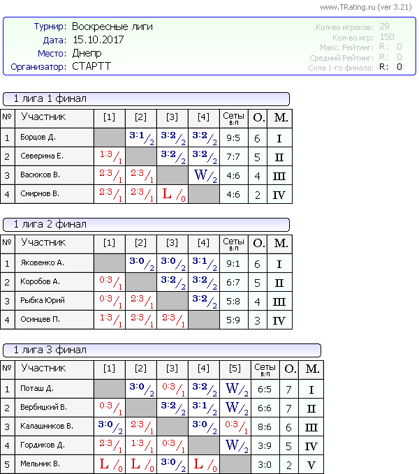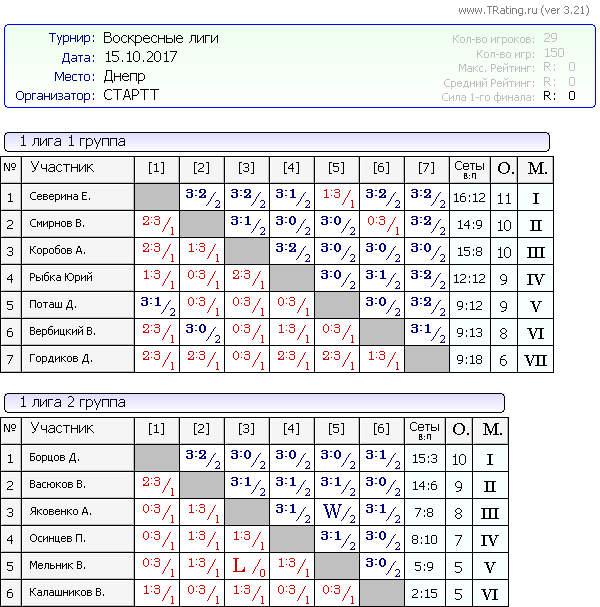 Результаты Воскресных лиг от 15.10.2017г