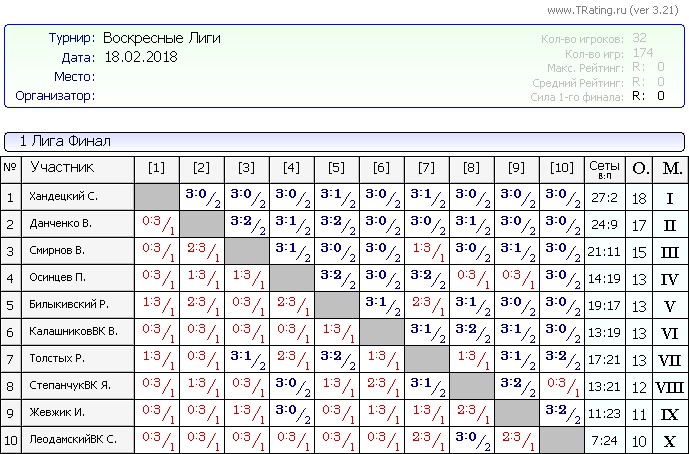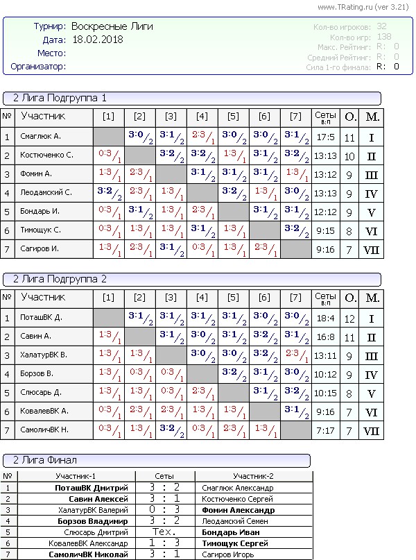 Результаты Воскресных лиг от 18.02.2018г