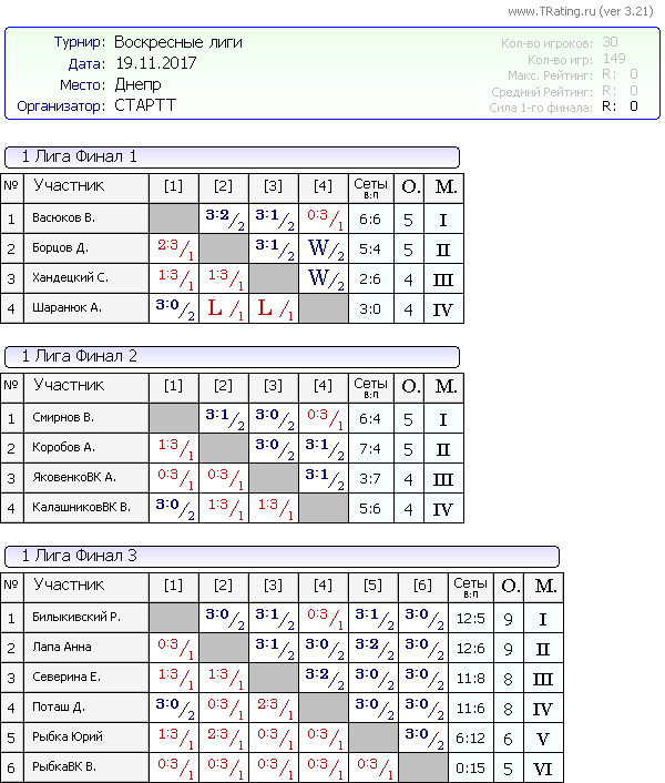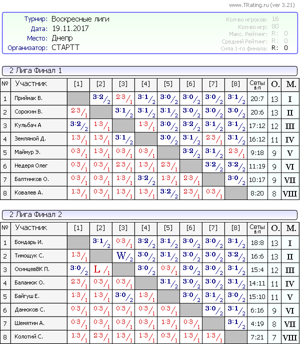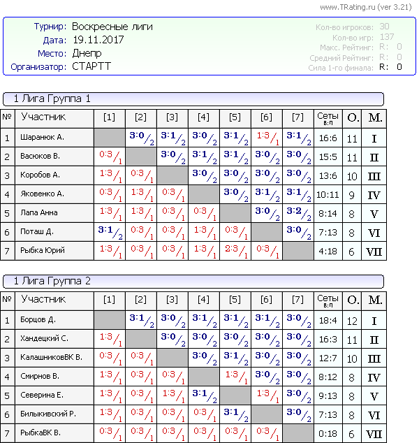 Результаты Воскресных лиг от 19.11.2017г