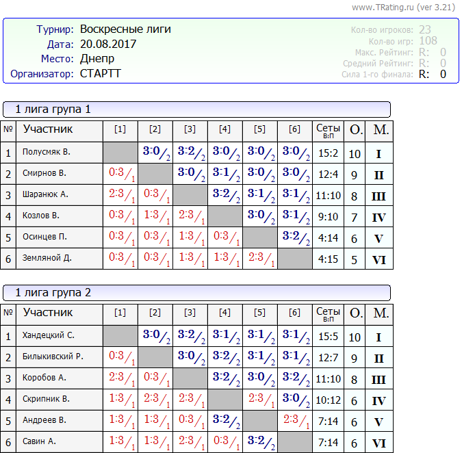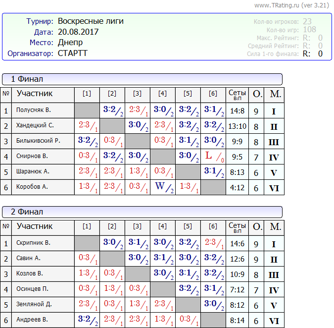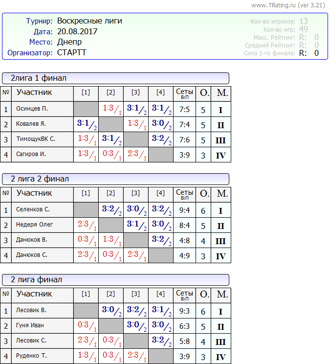Результаты Воскресных лиг от 20.08.2017г